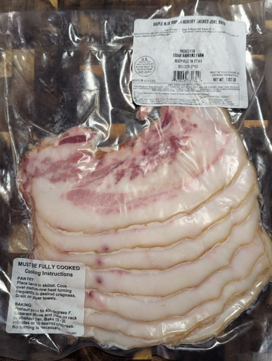 Jowl bacon is made from the pig's jowl or cheek. This cut contains more fat than traditional bacon, making it richer. Jowl bacon is cured in a similar manner as our regular bacon and has a slightly different flavor profile, with a more pronounced pork taste due to the unique cut. It is less commonly found than regular bacon but can be used in similar culinary applications, such as in soups, stews, or as a topping for various dishes.
